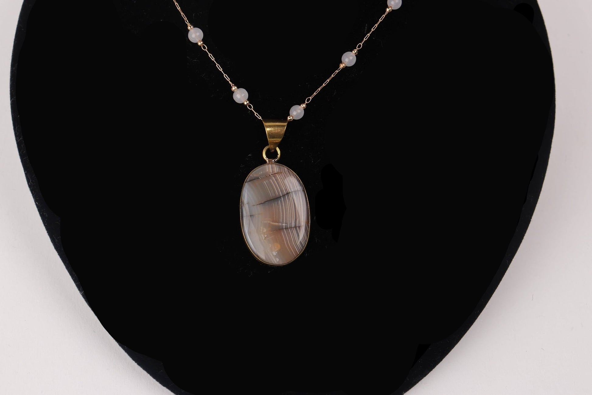 Natural Botswana agate pendant with soft banding and warm neutral tones. Each piece is hand-cut and set in a gold-tone bezel.